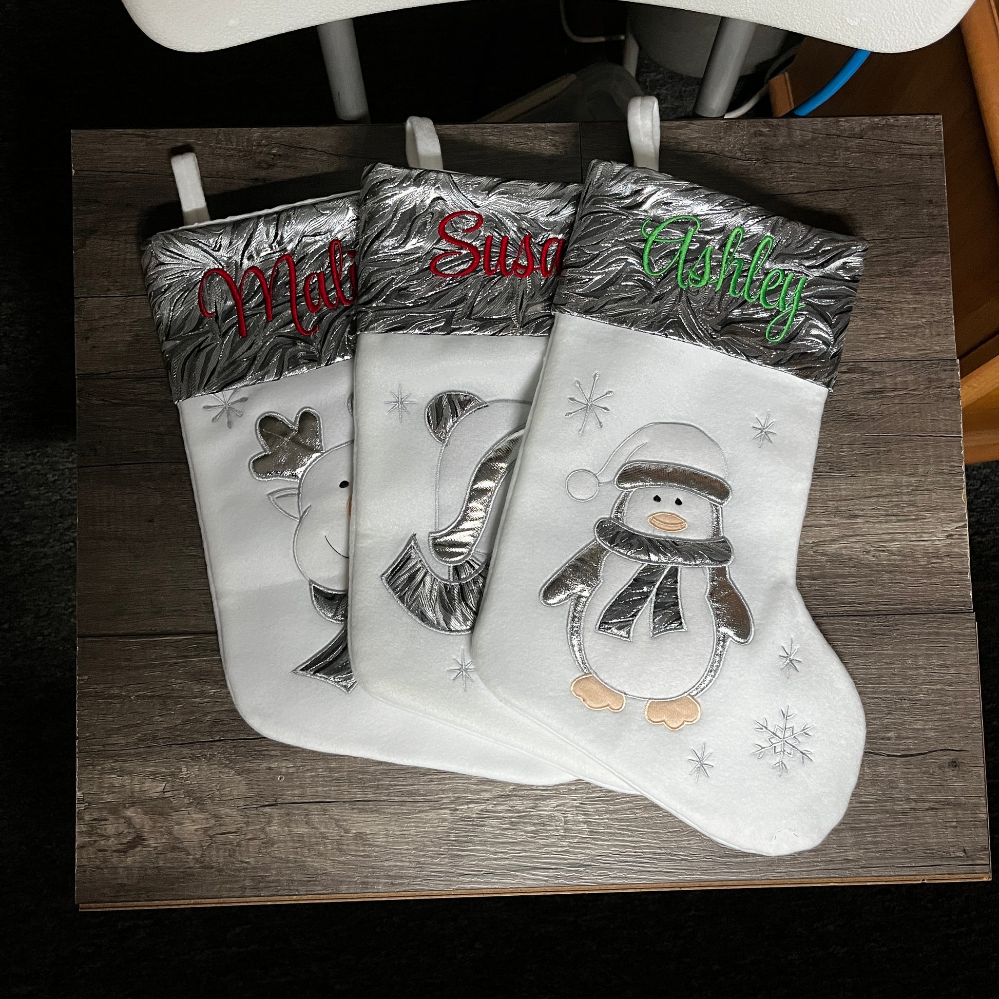 Personalized Christmas stockings with embroidered name and appliquéd Santa, Reindeer, Penguin or Snowman