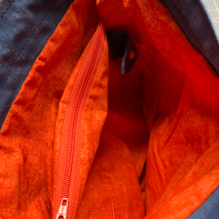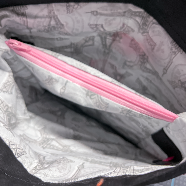 This series of bags is made with quilter's cotton and interfaced with woven interfacing to keep its shape. The inner zippered dividing pocket is fully sewn in to ensure nothing from one side can slip into the other side. It can hold your DPNs, extra needles, measuring tape, scissors, small knitting needle sets and much more.