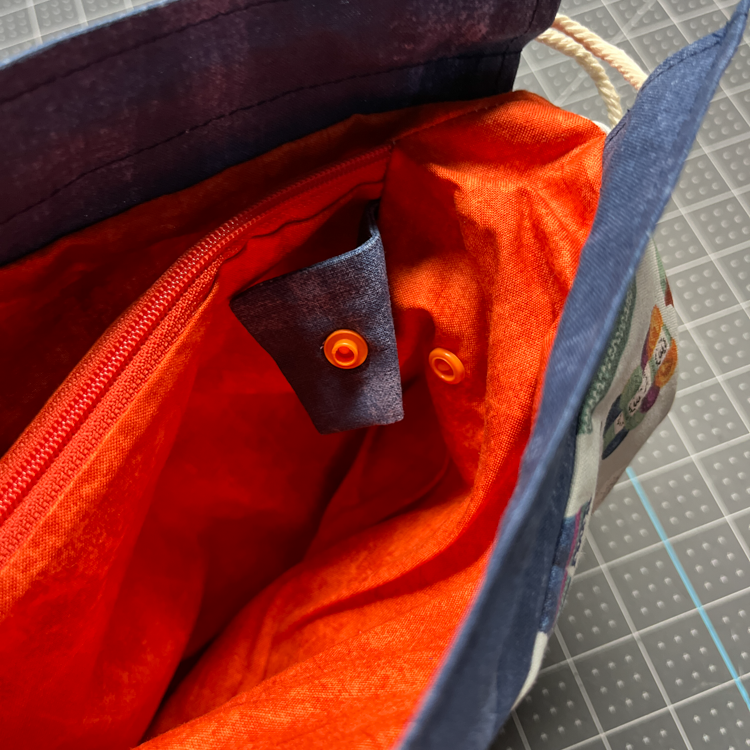 Des languettes à pression sont prévues de chaque côté afin de faire passer le fil à travers et d’éviter qu’il ne s’emmêle dans le sac. Les languettes à pression sont préférables aux œillets pour cet usage, car elles permettent de retirer le fil à tout moment, même en cours de projet. Les œillets, eux, vous obligent à terminer le projet avant de pouvoir enlever la laine.
